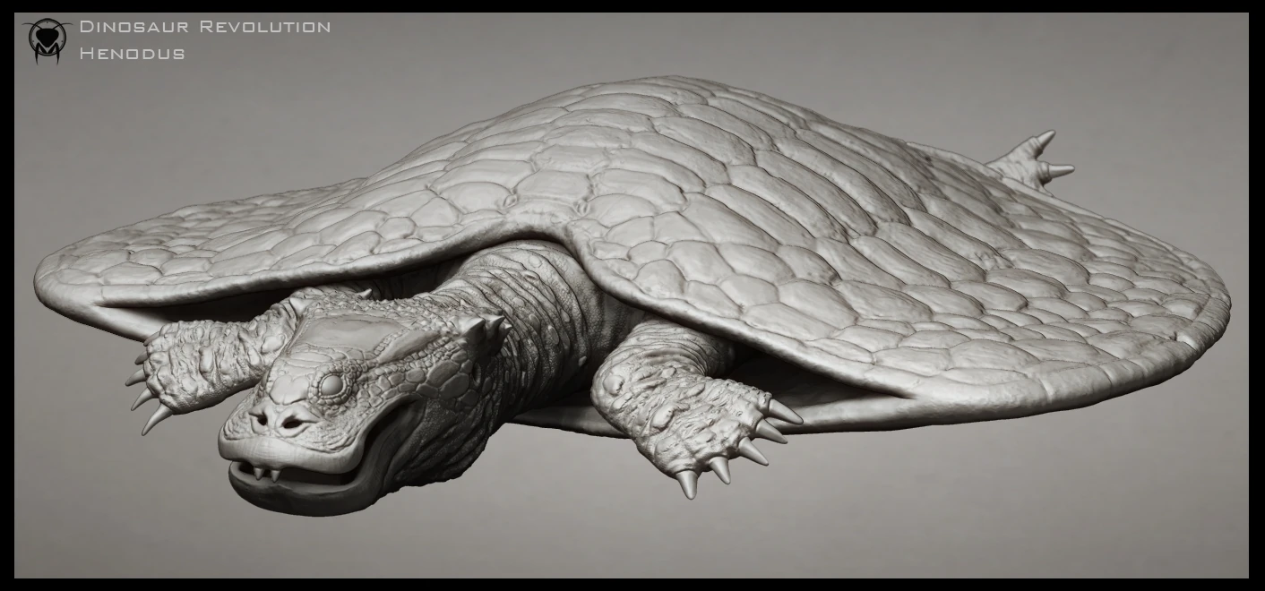 Henodus is a genus of placodont that lived during the Late Triassic period in what is now Europe. Henodus was originally supposed to appear in Dinosaur Revolution but was ultimately cut. It would have been depicted as a mulloscivore, but contrary to its planned depiction, recent evidence suggests Henodus was a filter-feeding herbivore that used its beak to scrape aquatic vegetation off of surfaces before sucking it into its mouth to filter it out of the water. |